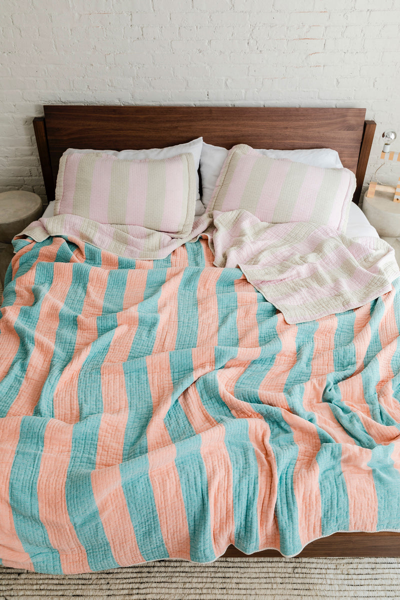 Stone-washed, woven matelassé coverlet with an inner layer of insulation for a quilted effect. Extra soft and gauzy hand feel. 100% cotton shell, polyester fill. Made in Portugal.